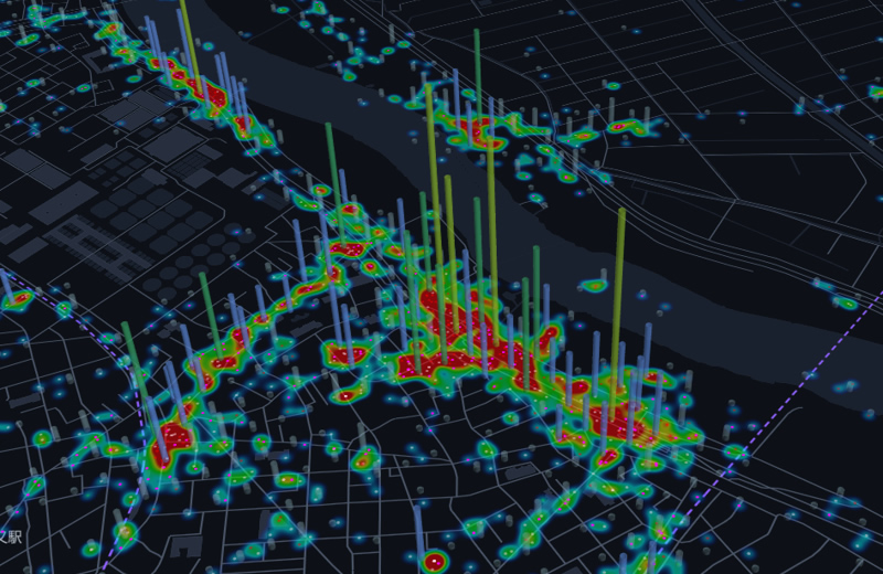 - 空間分布の把握:指定した期間・時間帯の滞留密度を可視化。メッシュサイズは任意(例:10m~500m)で、粒度と見やすさを両立します。
