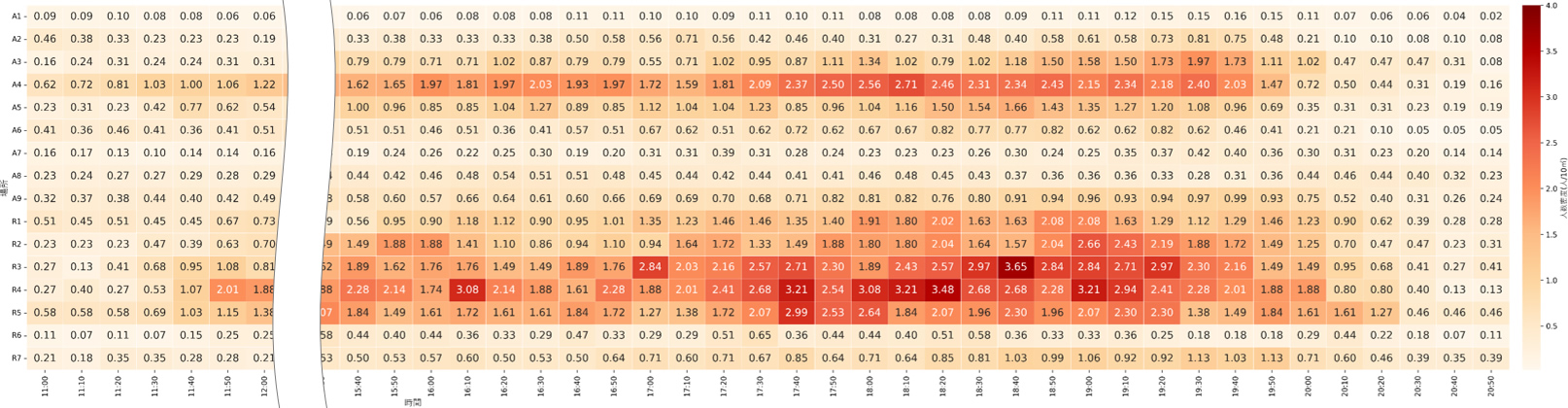 上の表は、縦軸がエリアの情報、横軸が時間経過になり、10㎡あたりので人口密度を示した例です。