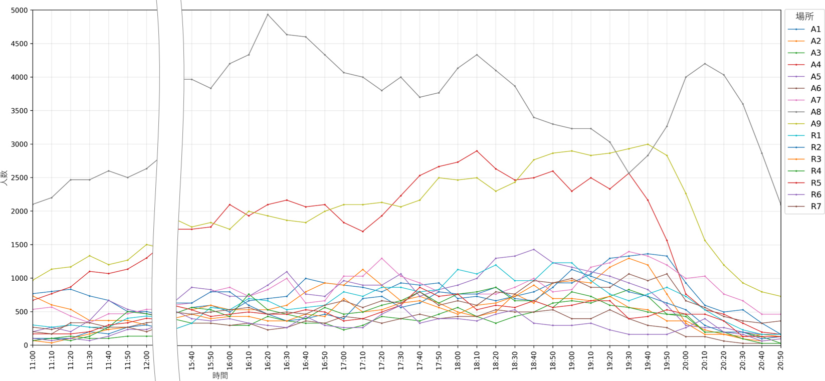 - 時間推移とピーク:来訪・滞在・退場の時系列を整理し、ピーク時刻/ピーク幅や滞留の持続時間を特定。