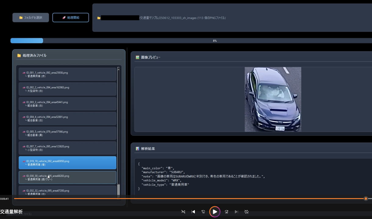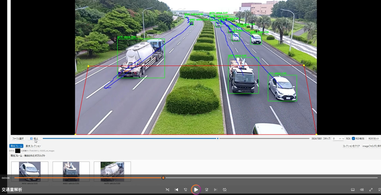 trafficDXは、交差点や道路区間の映像から交通実態を安定かつ再現性高く数値化する、アスペリアの自社開発エンジンです。映像の内容を解析に適した形へ整え、動きのある対象を抽出しつつ、停留の影響を過大に数えないための独自ロジックで“流れている交通”を際立たせます。これにより混雑時や信号待ちの場面でも、車種別・進行方向別・時間帯別の集計が崩れにくく、設計検討や信号最適化、社会実験の効果検証に耐える粒度で指標化が可能です。